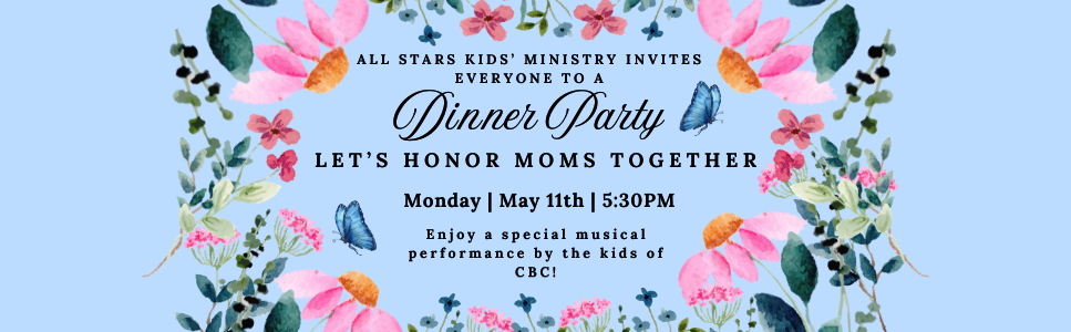 You don't have to be a mom to come and honor moms at a very special dinner hosted by the All Stars Children's Ministry of CBC! Come join us as we honor mothers and enjoy a special dinner and performance all made possible by the kids here at our church! Don't miss it.