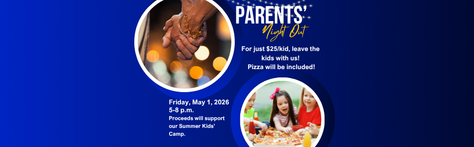 For just $25 per kid, leave the kids with us! Pizza will be included! Kids ages 0 through fifth grade are welcome to join the fun. Proceeds will support our Summer Kids’ Camp.